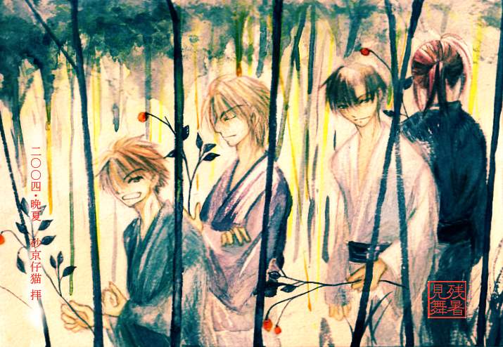 わーい4人だあ。しかも浴衣だあ!!。 URL教えて頂いたんですけど実はそれ以前に貰ってきてたんです。 Upの作業が遅れてただけで。失礼しました。 砂京さまのイラストってどれもすごく雰囲気があって素敵。 どうすればこんな色合いが出るんでしょう。 適度な距離を保ちながらそれぞれがそれぞれらしい、 砂京さまの文章の彼らがちゃんとイラストに再現されてるのも坂下的にツボです(照)。 ありがとうございました!!。